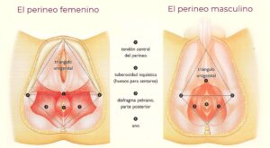 El suelo pélvico está compuesto por dos triángulos (anterior y posterior). En el centro del suelo pélvico se sitúa el tendón central del perineo, el cual elevamos y absorbemos hacia arriba y hacia dentro mediante el cierre de muladhara bandha.