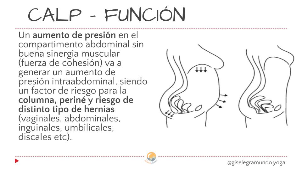 Un aumento de presión en el compartimento abdominal sin buena sinergia muscular (fuerza de cohesión) va a generar un aumento de presión intraabdominal, siendo un factor de riesgo para la columna, periné y riesgo de distinto tipo de hernias (vaginales, abdominales, inguinales, umbilicales, discales etc).
