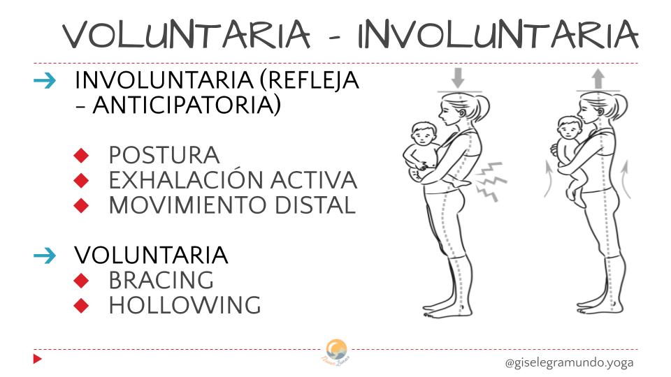 Durante la inhalación el diafragma se contrae y desciende. El descenso genera un aumento de la presión intraabdominal empujando el contenido hacia la pelvis. El suelo pélvico desciende y se contrae para sostener dicha presión. Durante la exhalación el diafragma se relaja y asciende. Las presiones dentro del abdomen disminuyen y el suelo pélvico sube.
