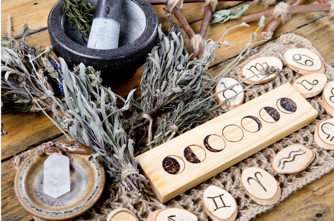 Para acompañar las fases lunares y tu propio proceso, podes preparar un espacio con un altar con objetos que representen los cuatro elementos en tu espacio de práctica: